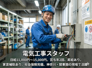 神奈川県内中心の電気工事スタッフ/一般住宅から工場まで対応|資格手当×家賃補助あり!