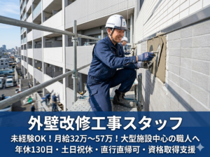 大型施設の外壁改修工事スタッフ/左官・防水・タイルを一貫施工|未経験でも月給32万円以上!