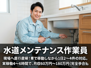職種 水道メンテナンス作業員 仕事内容 水道トラブルやメンテ…