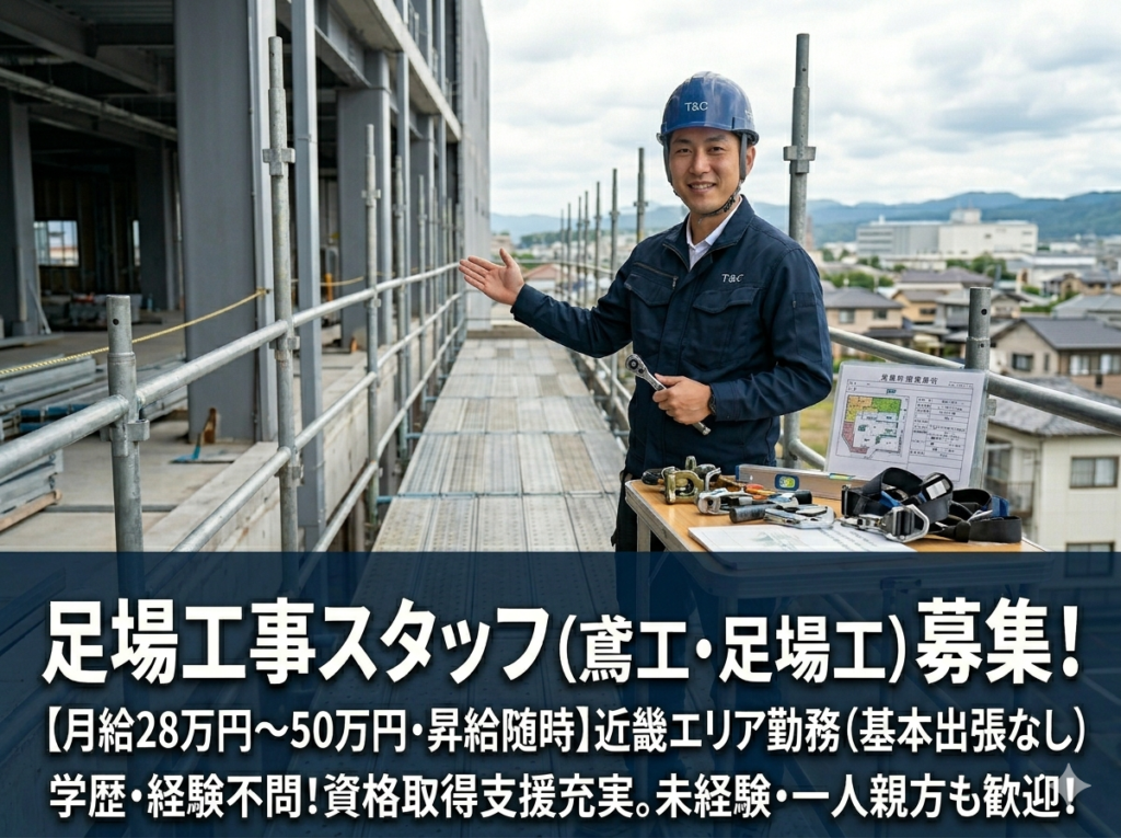 - 建設現場における仮設工事一式・足場工事・鳶工事に従事していただきます。 建設現場ではさまざまな職種が関わりますが、最初に現場へ入り足場を組むのが鳶職人です。足場が完成してはじめて、他業種の工事が安全に始まります。 <主な業務内容> ・足場の組立作業 ・足場の解体作業 ・仮設工事一式 ・現場での安全確認および連携業務 現場では複数人で作業を行い、安全を確保しながら施工を進めていきます。 報告・連絡・相談を徹底し、チームで現場を支える仕事です。 足場工事は、現場の安全と工事のスタートを支える役割を担っています。 経験を重ねることで任される範囲が広がり、それが収入にも反映されていきます。 資格を取得することで対応できる業務が増え、技術職としての専門性を高めていくことが可能です。 社内教育制度や資格取得支援制度が整っており、未経験からでも段階的に技術を身につけられる環境があります。一人親方や協力会社としての応募にも対応しています。 【ここがポイント】 ・現場の「最初」を任される足場工事の専門職 ・未経験から技術職として収入アップを目指せる ・月給28万円~50万円、経験や技術に応じて昇給 ・資格取得費用は会社負担、できる仕事の幅が広がる ・兵庫・大阪中心の近畿エリア勤務(基本出張なし)