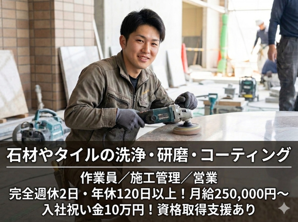 - 当社は、石材やタイルの洗浄・研磨・コーティングを行う専門会社です。